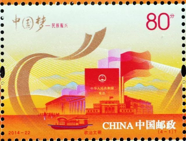 第四次:2014年9月20日,中國郵政發(fā)行2014-22《中國夢―民族振興》郵票一套4枚,其中(4-1)“政治文明”圖案由包括南湖紅船在內(nèi)的建黨治國元素組成:郵票畫面從政治角度體現(xiàn)出黨和國家成立以來社會制度取得的巨大進(jìn)步。在這枚郵票上,既有上海一大會址,突出的嘉興南湖紅船又賦予了新的時代意義。