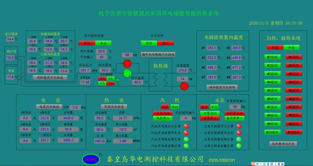 2020年11月5日,秦皇島華電測控科技有限公司保質(zhì)保量地完成了秦皇島市某鎮(zhèn)政府供熱系統(tǒng)改造工作,并于11月5日開啟了供暖工作。本次改造工作,將原有的燃油鍋爐改造成智能電儲能供熱系統(tǒng),實(shí)現(xiàn)環(huán)保取暖與智能控制等多重效果。