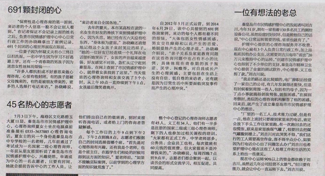 總經(jīng)理劉吉川先生的這一善行,受到了社會各界的廣泛關注,燕趙都市報、秦皇島晚報等各大媒體先后進行了采訪和報道。這也使得秦皇島市市民情感護理中心更廣泛的為人所知,從而能夠給廣大民眾提供更多的幫助,更好地服務于人民、服務于社會,最終為打造積極生態(tài)圈、構建和諧社會、實現(xiàn)偉大的中國夢貢獻力量!