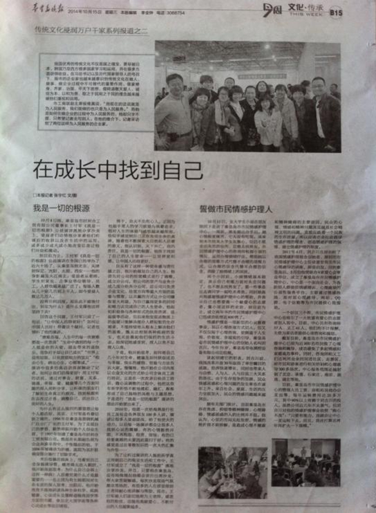 摘自《秦皇島晚報》(2014年10月15日,B15版):情感護理是一項新型的心靈慈善事業(yè),其以心理咨詢方式切入,但又不僅僅限于心理咨詢,更側重于人生觀、價值觀、幸福觀的引導。秦皇島市市民情感護理中心的創(chuàng)始人名叫劉吉川,今年51歲,秦皇島華電測控設備有限公司總經(jīng)理。