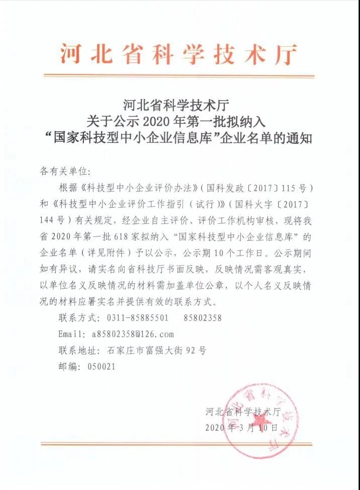 近日,河北省科技廳根據(jù)《科技型中小企業(yè)評價辦法》(國科發(fā)政【2017】115號)、《科技型中小企業(yè)評價辦法工作指引(試行)》(國科火字【2017】144號)要求,公示通過河北省2020年第一批“科技型中小企業(yè)”名單。我公司憑借在企業(yè)科技創(chuàng)新領域的成就成功入選,入庫登記編號:202013030209000247。