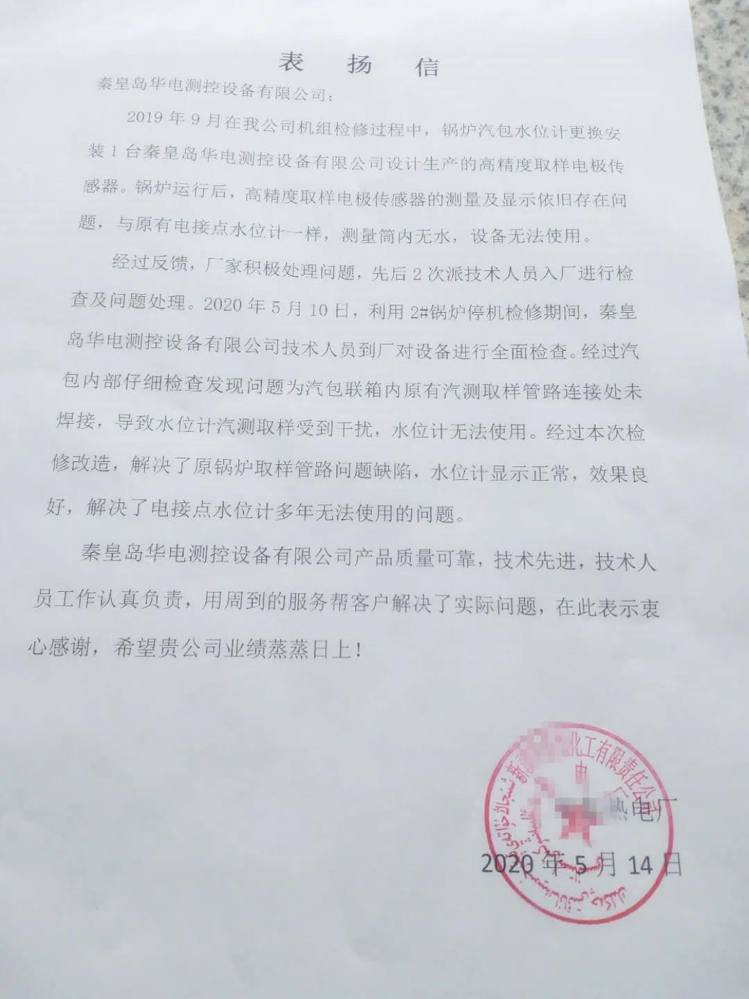 2020年5月15日,華電測控收到來自新疆某化工有限公司的表揚(yáng)信,表揚(yáng)我公司解決了該廠鍋爐汽包電接點(diǎn)水位計(jì)多年無法使用的問題。信中對我公司的產(chǎn)品質(zhì)量、全新全意為客戶服務(wù)的理念以及技術(shù)人員認(rèn)真負(fù)責(zé)的工作態(tài)度均給予肯定。