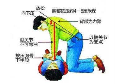 4.心肺復(fù)蘇:兩只手掌根重疊置于傷者胸骨中下1/3處,男性在兩乳頭連線中點(diǎn)。肘關(guān)節(jié)伸直,借助身體之重力向傷者脊柱方向按壓。按壓頻率100――120次/分。單人搶救時(shí),每按壓30次,俯下做口對(duì)口人工呼吸2次(30:2)。雙人CPR時(shí)可采用15:2的比率。