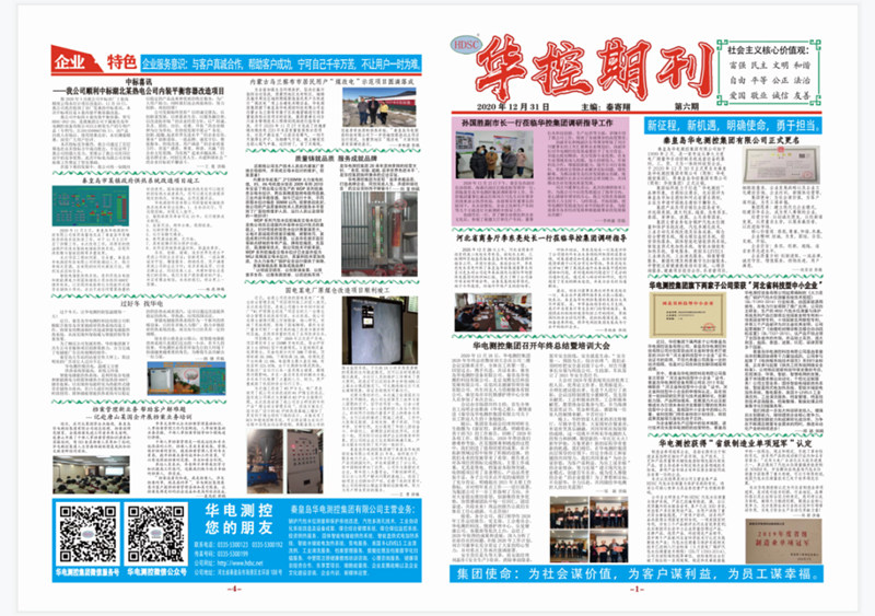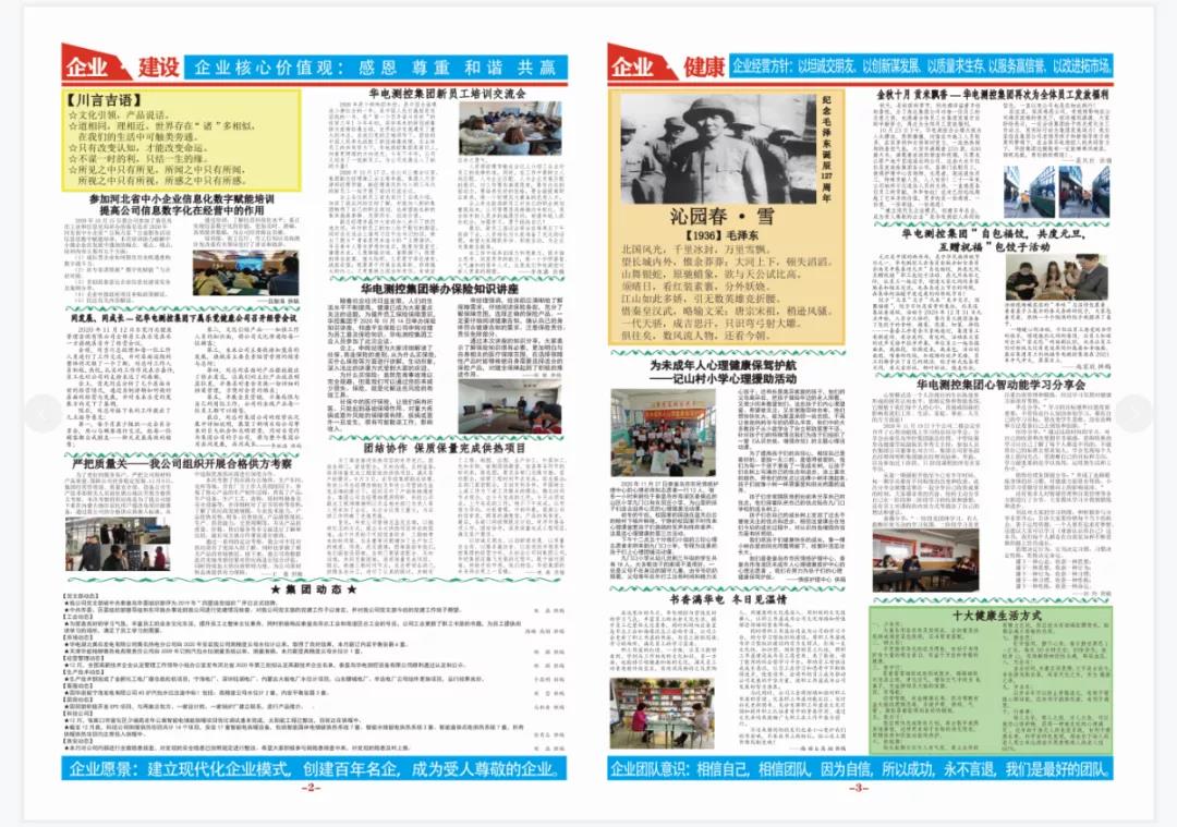 華電測控期刊自創(chuàng)建成立以來,以集團各子公司發(fā)展主營業(yè)務、黨建活動、情感護理、健康管理為內(nèi)容,旨在向大家宣傳公司的企業(yè)文化和致力于打造“華電測控”品牌形象,堅持為社會謀價值、為客戶謀利益、為員工謀幸福的集團使命;堅持建立現(xiàn)代化企業(yè)模式、創(chuàng)建百年名企、成為受人尊敬企業(yè)的集團愿景;堅持“以坦誠交朋友、以創(chuàng)新謀發(fā)展、以質(zhì)量求生存、以服務贏信譽、以改進拓市場”的企業(yè)經(jīng)營方針;以“坦誠、負責、團結(jié)、自信、克難、開拓”的企業(yè)精神為行為導向;在持續(xù)發(fā)展中展示“務實、創(chuàng)新、超越、追求世界先進水平”的企業(yè)宗旨;秉承“創(chuàng)新進取、一流品牌、誠實守信、增值服務、持續(xù)改進、用戶滿意”的企業(yè)質(zhì)量方針;營造“感恩、尊重、和諧、共贏”的企業(yè)文化氛圍。