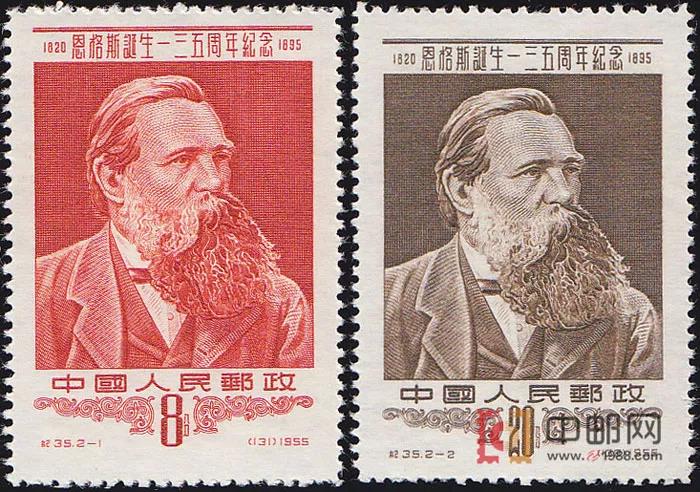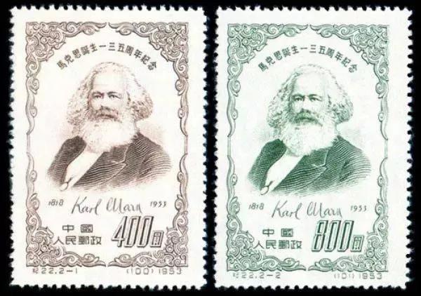 1958年7月1日,原郵電部發(fā)行紀(jì)51《共產(chǎn)黨宣言發(fā)表一百一十周年》紀(jì)念郵票,全套2枚,由孫傳哲設(shè)計(jì),中國(guó)近代印刷公司雕刻版印刷。其中第一枚“馬克思和恩格斯像”,面值4分。圖案為充滿睿智、蓄著胡須的馬克思和恩格斯側(cè)面像。