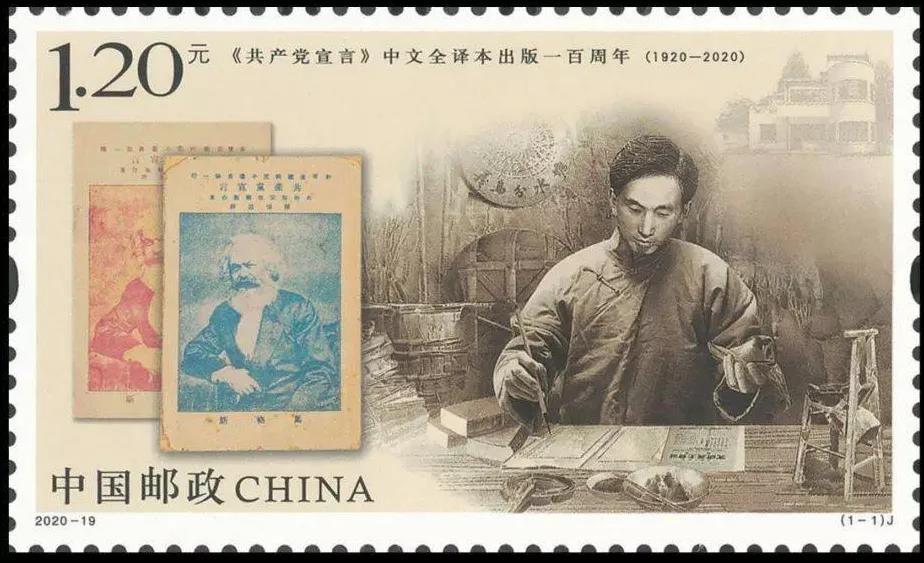 我需要介紹2020年發(fā)行的紀(jì)念郵票:紅印和藍(lán)印馬克思半身肖像的《共產(chǎn)黨宣言》中文全譯本早期版本書(shū)影,透射著這本“小冊(cè)子”穿越百年的真理光芒;用鉛筆繪制的陳望道還是未及“三十而已”的年輕模樣,一手奮筆疾書(shū),一手拿著沾了墨汁的粽子,“柴屋勤譯”的場(chǎng)景被高度還原;右上角,位于上海市楊浦區(qū)國(guó)福路51號(hào)的《共產(chǎn)黨宣言》展示館(陳望道舊居)見(jiàn)證著他在復(fù)旦長(zhǎng)期工作的歲月和復(fù)旦人對(duì)老校長(zhǎng)故事的代代講述、對(duì)“宣言精神”的忠實(shí)傳承……