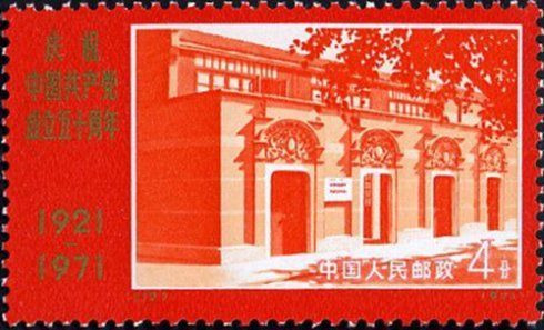 1971年7月1日發(fā)行的編12―20《慶祝中國共產(chǎn)黨成立50周年》紀(jì)念郵票,全套6枚。其中第1枚是“中共一大會址”,由許彥博設(shè)計(jì),影寫版,主圖為“一大會址”外景,畫面邊框采用紅底金字,表示建黨50周年的熱烈吉慶。在構(gòu)圖上突出了掛在自左第一、二扇門之間的石牌,牌上鐫刻著“中國共產(chǎn)黨第一次全國代表大會會址”、“全國重點(diǎn)文物保護(hù)單位”和“中華人民共和國國務(wù)院一九六一年三月四日公布”字樣。 《慶祝中國共產(chǎn)黨成立50周年》郵票首次“不走樣”地展現(xiàn)了中共一大會址的外景,整個票面紅彤彤的,象征著黨從這座石庫門中誕生,一路走來、走向輝煌的歷程。