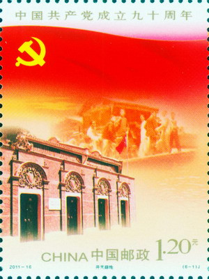 建黨90周年郵票:中國郵政于2011年6月22日發(fā)行《中國共產(chǎn)黨成立九十周年》紀(jì)念郵票1套6枚,小型張1枚。設(shè)計(jì)者:郝旭東。面值1.20元。