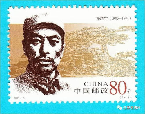 國(guó)家郵政局2005年8月1日發(fā)行《人民軍隊(duì)早期將領(lǐng)(二)》紀(jì)念郵票1套5枚。志號(hào):2005-26。設(shè)計(jì):閻炳武。其中第一枚是抗日英雄楊靖宇。(5-1)J ,楊靖宇,面值80分,發(fā)行860萬(wàn)枚。