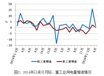 1-4月份,全國工業(yè)用電量12369億千瓦時(shí),同比增長(zhǎng)0.2%,增速比上年同期提高1.0個(gè)百分點(diǎn),占全社會(huì)用電量的比重為68.4%,對(duì)全社會(huì)用電量增長(zhǎng)的貢獻(xiàn)率為4.5%。其中,輕工業(yè)用電量2075億千瓦時(shí),同比增長(zhǎng)3.6%,增速比上年同期提高1.7個(gè)百分點(diǎn);重工業(yè)用電量為10295億千瓦時(shí),同比下降0.5%,增速比上年同期提高0.8個(gè)百分點(diǎn)。