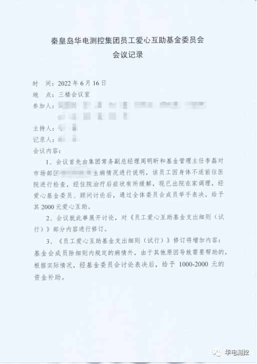 一直以來,華電測控集團(tuán)始終把員工的切身利益放在首位,想員工所想,急員工所急。我們堅信:只有具有溫情和強(qiáng)烈社會責(zé)任感的企業(yè),才能走得更遠(yuǎn)!未來,華電測控集團(tuán)愛心互助基金管理委員會將會繼續(xù)發(fā)揮其作用,為需要更多幫助的員工及家屬伸去援助之手,把公司的溫暖和關(guān)愛送到了廣大職工的心坎上,不斷增強(qiáng)職工的凝聚力,助力打造百年名企!