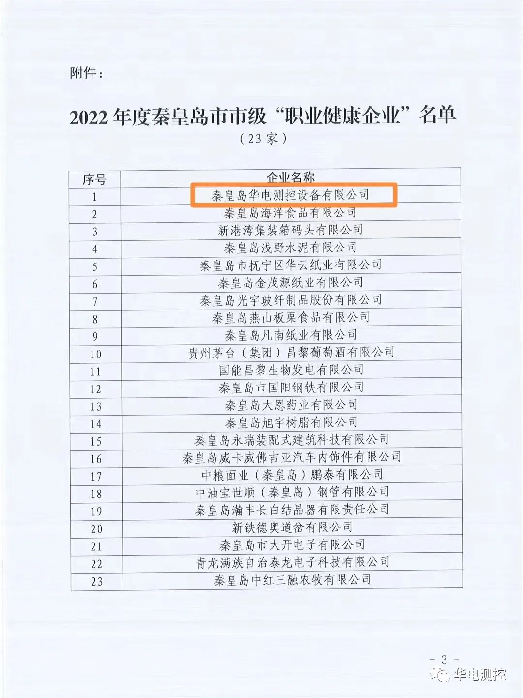 秦皇島華電測(cè)控設(shè)備有限公司獲評(píng)為2022年度秦皇島市職業(yè)健康企業(yè)