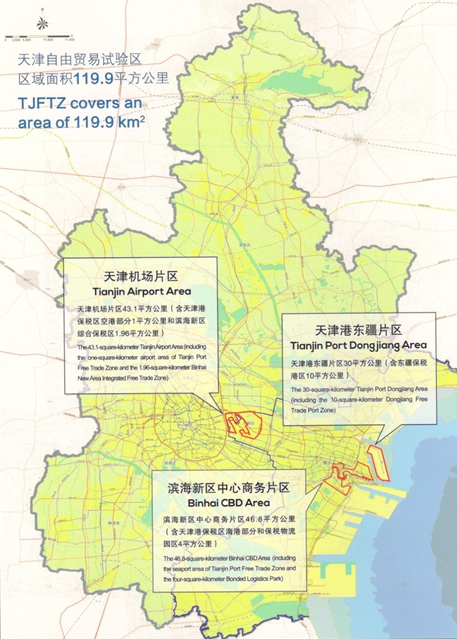 天津自貿(mào)區(qū)2014年12月31日獲國務院正式批復,2015年4月21日正式掛牌,總面積119.9平方公里,是我國北方第一個自貿(mào)試驗區(qū),也是繼上海成立自貿(mào)區(qū)以來,與福建、廣東同時獲批的第二批自由貿(mào)易試驗區(qū)之一。其產(chǎn)業(yè)定位涵蓋了面積30平方公里,以發(fā)展航運物流、國際貿(mào)易、融資租賃等現(xiàn)代服務業(yè)為主的天津港東疆片區(qū);面積43.1平方公里,以發(fā)展高端制造業(yè)和與之配套的生產(chǎn)性服務業(yè)為主的天津機場片區(qū);面積46.8平方公里,以發(fā)展金融創(chuàng)新為主的現(xiàn)代服務業(yè)濱海新區(qū)中心商務片區(qū)三個片區(qū)。