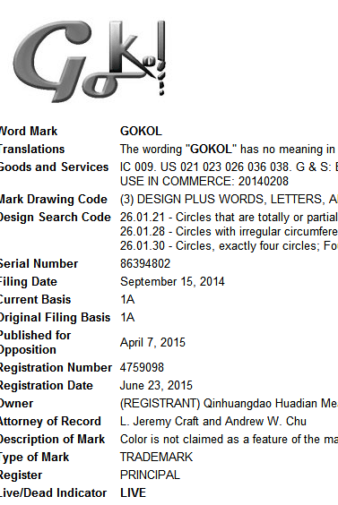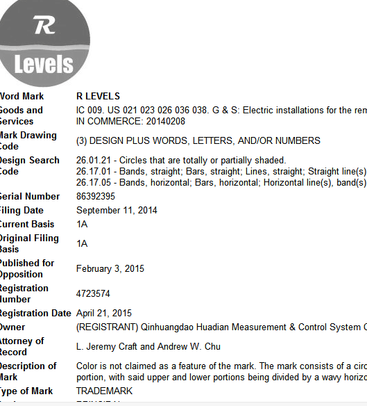 為了開(kāi)拓美國(guó)市場(chǎng),將公司產(chǎn)品盡快銷往美國(guó),2014年9月,公司正式將鍋爐汽包水位測(cè)量與保護(hù)系統(tǒng)(R-Levels)和煤倉(cāng)綜合管理系統(tǒng)(Gokol)兩個(gè)商標(biāo)向美國(guó)商標(biāo)局提交正式申請(qǐng)注冊(cè)文件,經(jīng)美國(guó)商標(biāo)局嚴(yán)謹(jǐn)審核認(rèn)證,近日已經(jīng)獲美國(guó)商標(biāo)局的正式注冊(cè)。