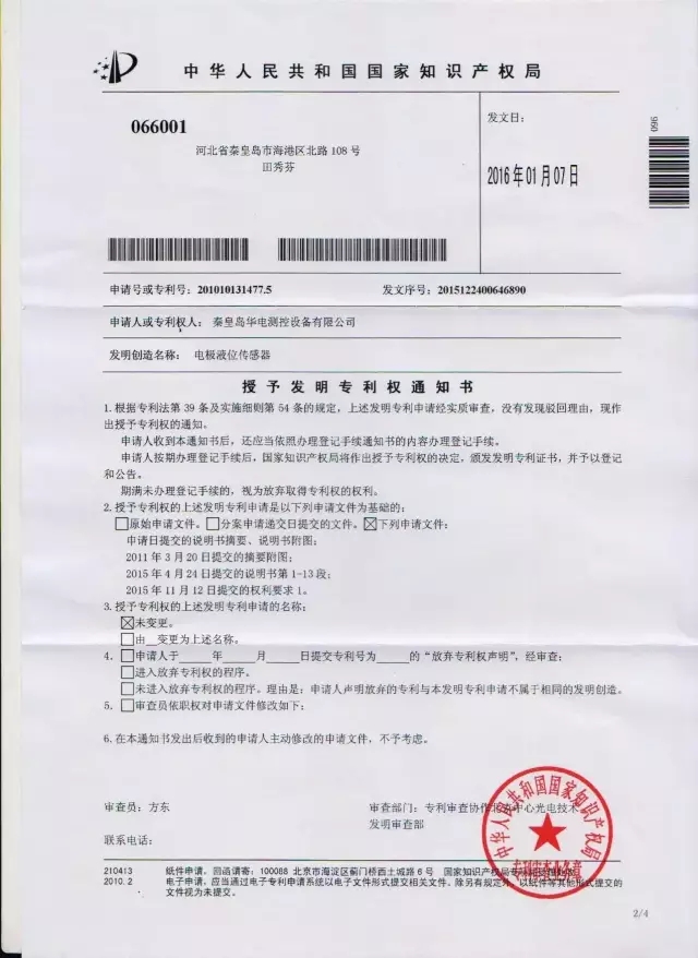 新年伊始,佳音頻傳。公司于2010年2月26日提交的“電極液位傳感器”專(zhuān)利已被中華人民共和國(guó)國(guó)家知識(shí)產(chǎn)權(quán)局授權(quán)發(fā)明專(zhuān)利權(quán)。