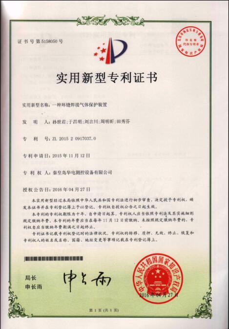 在此項(xiàng)目研發(fā)過(guò)程中,由于昌明和孫世君共同研發(fā)的“一種環(huán)縫焊接氣體保護(hù)裝置”已被中華人民共和國(guó)國(guó)家知識(shí)產(chǎn)權(quán)局頒發(fā)實(shí)用新型專利證書(shū)。