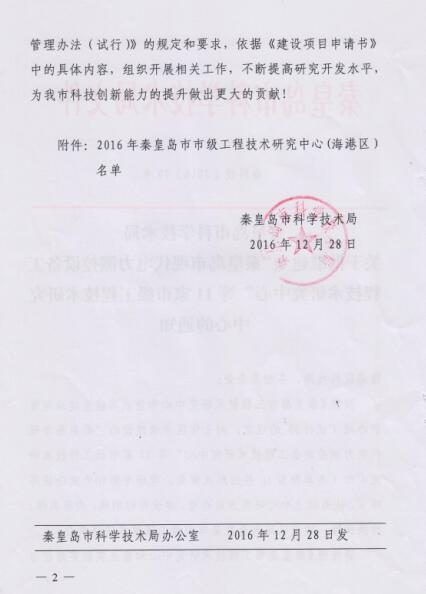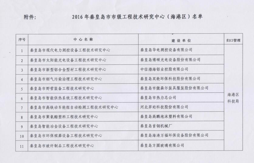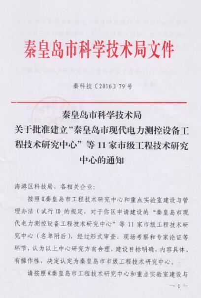 2016年公司申請建設(shè)的“秦皇島現(xiàn)代電力測控設(shè)備工程技術(shù)研究中心”市級工程技術(shù)研究中心,經(jīng)過秦皇島市科學(xué)技術(shù)局組織進行的形式審查、現(xiàn)場考察和專家論證等環(huán)節(jié),認(rèn)為中心研究方向合理,建設(shè)目標(biāo)明確,內(nèi)容具體、有操作性,被認(rèn)定為秦皇島市市級工程技術(shù)研究中心。
