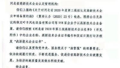 近日,秦皇島華電測(cè)控設(shè)備有限公司收到了全國高新技術(shù)企業(yè)認(rèn)定管理工作領(lǐng)導(dǎo)小組辦公室下發(fā)的《關(guān)于河北省2020年第三批高新技術(shù)企業(yè)備案的復(fù)函》(國科火字〔2020〕243號(hào)〕文件,公司第六次順利通過高新技術(shù)企業(yè)認(rèn)定More
