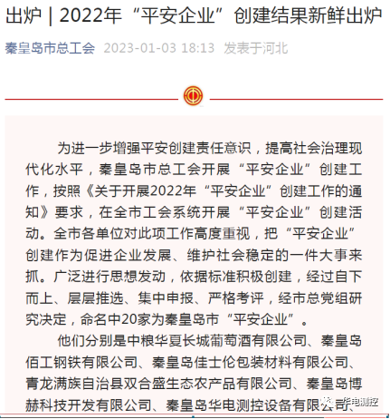 秦皇島華電測控設(shè)備有限公司被命名為2022年秦皇島市“平安企業(yè)”” 2023-01-212022年,為進(jìn)一步增強(qiáng)企業(yè)安全生產(chǎn)主體責(zé)任和全員安全責(zé)任意識,有效提升企業(yè)安全管理水平,秦皇島華電測控設(shè)備有限公司響應(yīng)秦皇島總工會開展的“平安企業(yè)”創(chuàng)建工作,按照《關(guān)于開展2022年“平安企業(yè)”創(chuàng)建工作的通知》要求,打造高標(biāo)準(zhǔn)“平安企業(yè)”。經(jīng)過嚴(yán)格考評,秦皇島華電測控設(shè)備有限公司被秦皇島市總工會命名為2022年秦皇島市“平安企業(yè)”。More