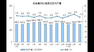 國家統(tǒng)計(jì)局:4月全國發(fā)電量4444億千瓦時下降1.7%” 2016-05-16中國電力網(wǎng)訊 (記者齊濤)5月14日,國家統(tǒng)計(jì)局發(fā)布數(shù)據(jù)稱, 2016年4月份規(guī)模以上工業(yè)增加值增長6.0%,其中,發(fā)電量4444億千瓦時,下降1.7%。 2016年4月份,規(guī)模以上工業(yè)增加值同比實(shí)際增長6.0%(以下增加值增速均為扣除價(jià)格因More
